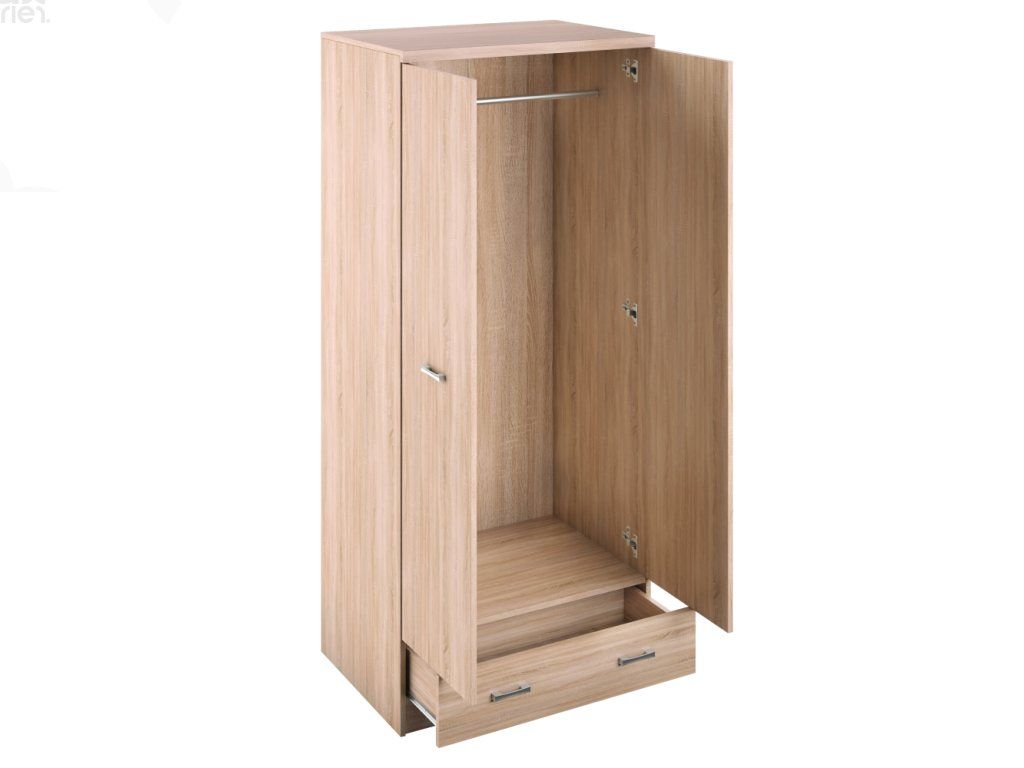 Praktický design: dvoudveřová skříň s věšákovou částí a šuplíkem poskytuje dostatek místa pro oblečení, doplňky i sezónní věci.