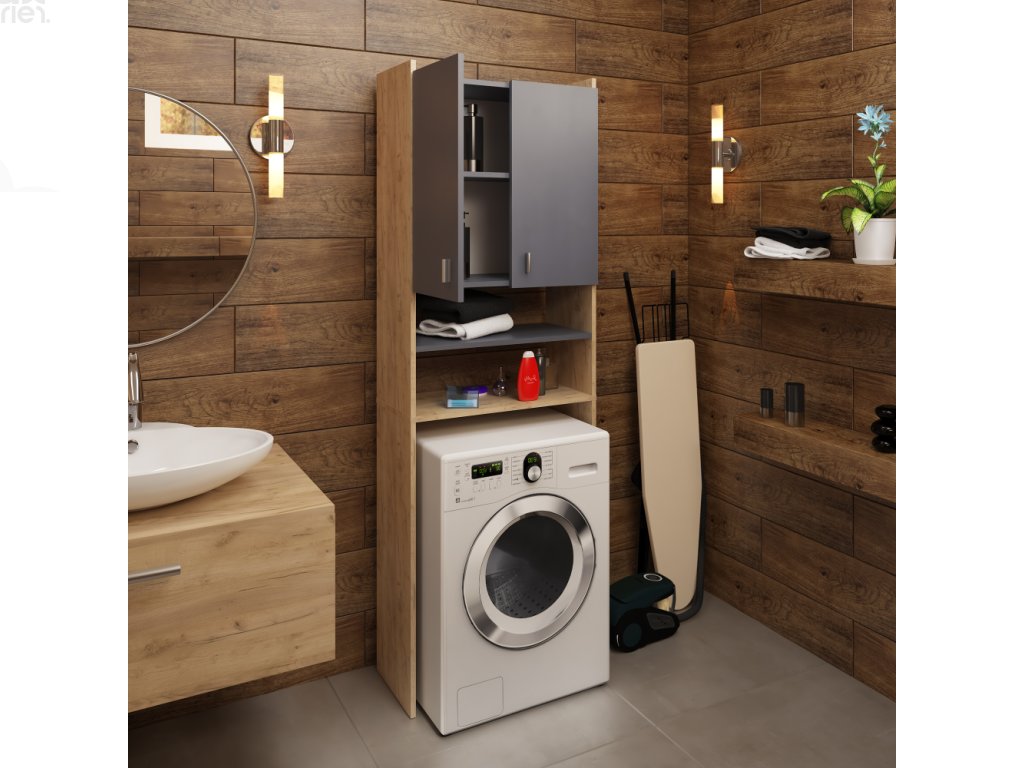 Skříňka nad pračku MARTIEN NEW v barevném provedení dub artisan / grafit je praktickým a zároveň moderním řešením pro koupelny a prádelny, kde je potřeba efektivně využít dostupný prostor. Umístění nad pračkou umožňuje vytvořit další úložnou plochu bez nároků na podlahovou plochu, což je ideální zejména pro menší interiéry.