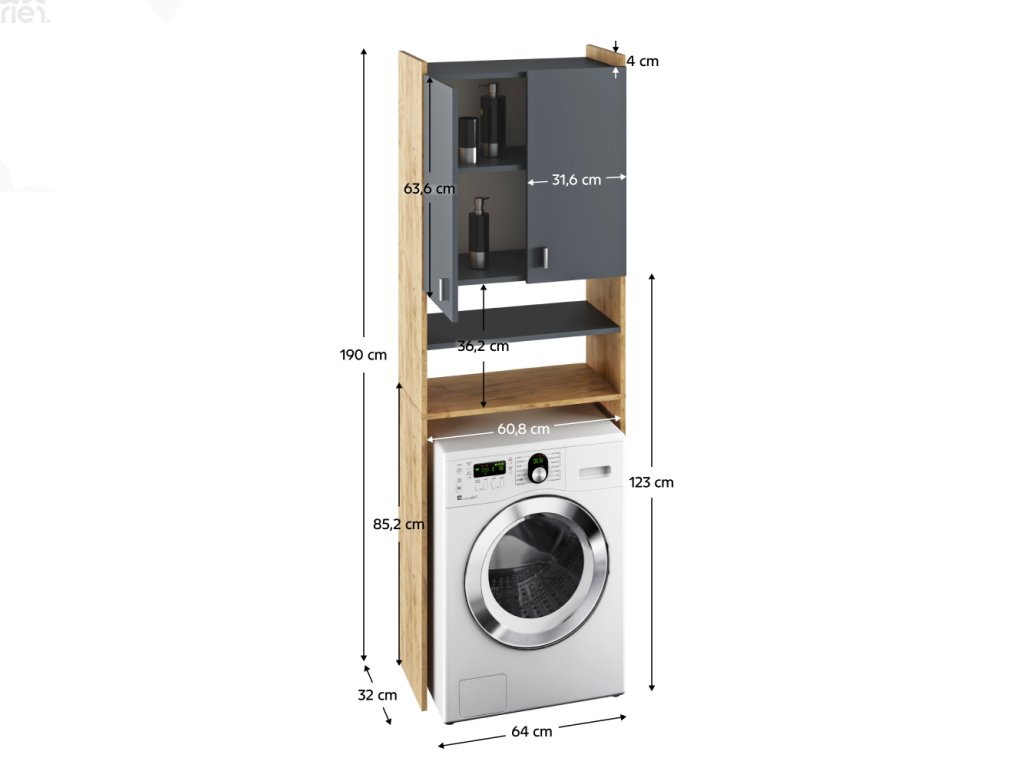 Celkové rozměry skříňky jsou 64 × 32 × 190 cm, prostor pro pračku je přizpůsoben standardním modelům o rozměrech 60,8 × 32 × 85,2 cm. Kombinace dekoru dub artisan s kontrastním grafitem působí moderně a nadčasově a snadno se začlení do současných koupelnových i technických interiérů. Skříňka přispívá k přehledné organizaci prostoru a zachovává si svůj funkční i estetický vzhled i při dlouhodobém používání.