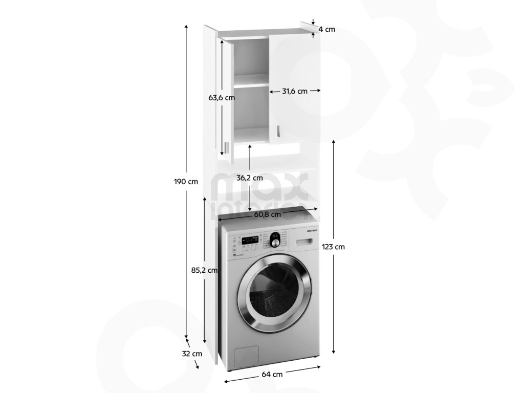 Skříňka vytváří úložné místo nad pračkou, takže zbytečně nezabírá další plochu v místnosti. Prostor na pračku o rozměrech 60,8×32×85,2 cm je optimalizovaný pro běžné modely.