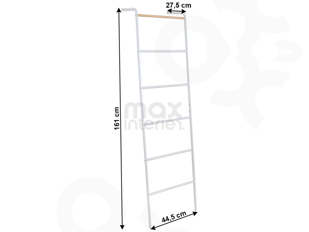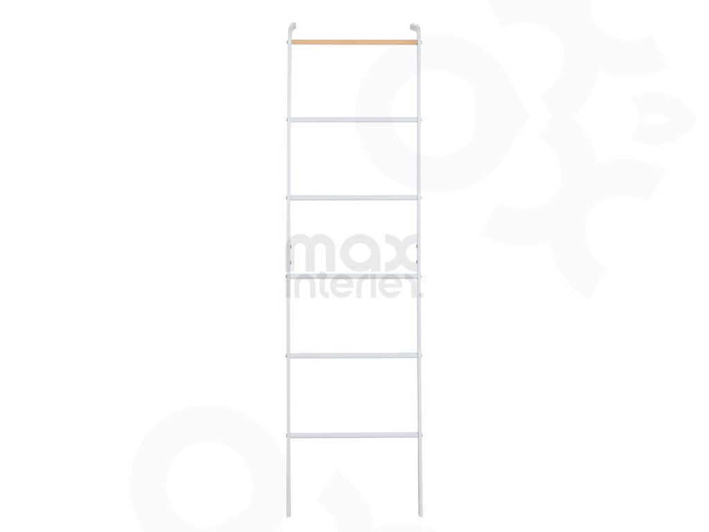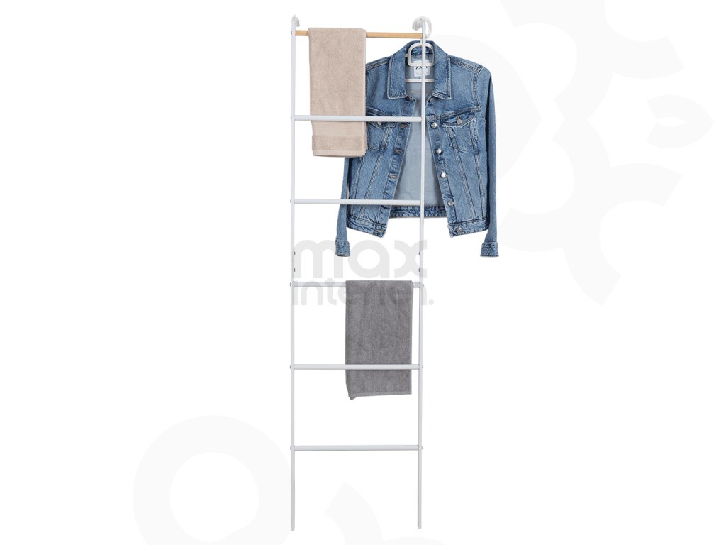 Žebříkový věšák BUNNY v bílé barvě s povrchovou úpravou v dekoru buku vyniká jednoduchým a moderním designem, který se hodí do každého interiéru. Díky kovové konstrukci je stabilní, odolný a snadno udržitelný. S nosností 15 kg nabízí praktické řešení pro přehledné odkládání oblečení v ložnici, předsíni, hotelovém pokoji nebo na internátu.