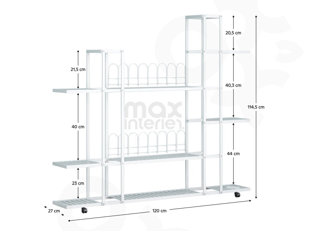 Květinový stojan LASKIA bílý přináší spojení moderního designu, praktického provedení a odolné kovové konstrukce. Je vyroben z pevného železa a jeho čistá bílá barva se snadno kombinuje s jakýmkoli interiérem. Díky rozměrům 120 × 27 × 114,5 cm nabízí dostatek prostoru pro vystavení hrnkových rostlin, dekorací nebo drobných doplňků.