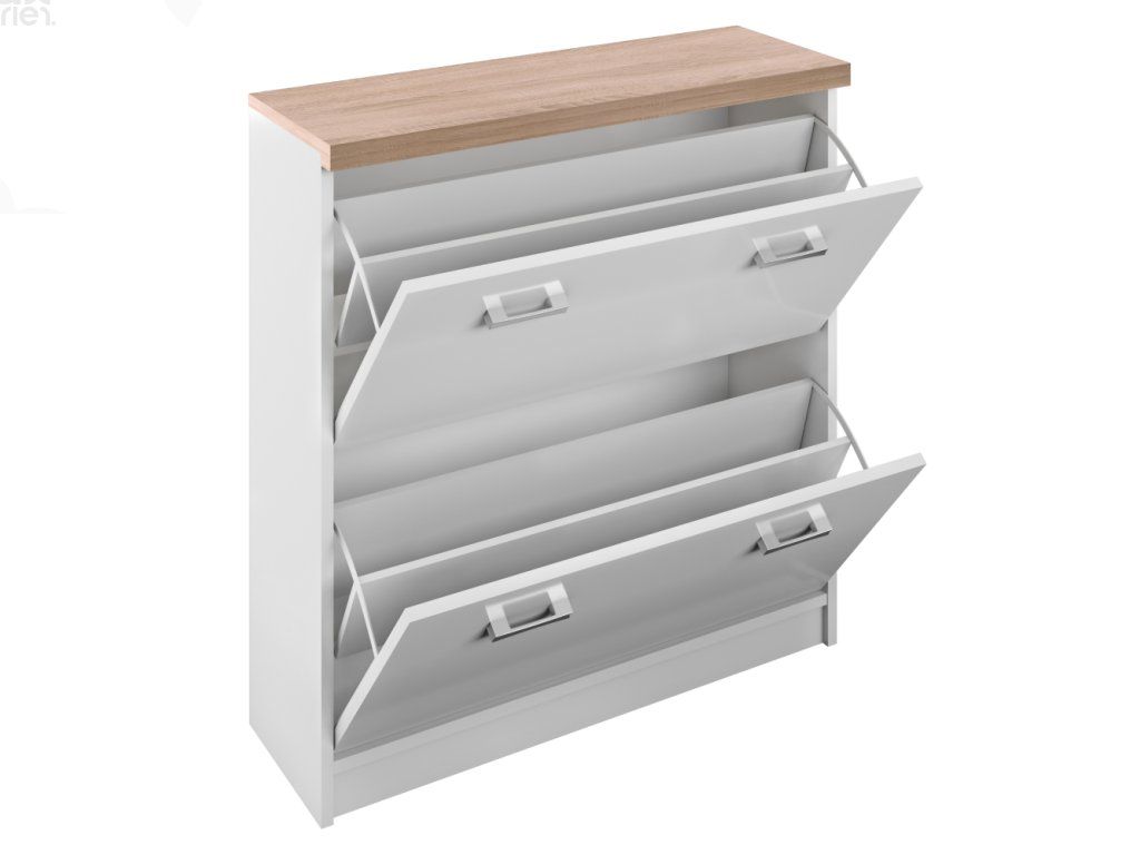 Výklopný botník CROMWEL TYP 11 v moderním provedení bílá / dub sonoma je praktickým a elegantním doplňkem každé předsíně. Díky kompaktním rozměrům 80 × 27 × 85 cm nabízí dostatek úložného prostoru i v menších místnostech.