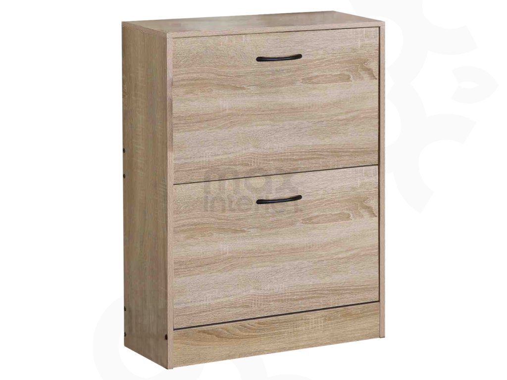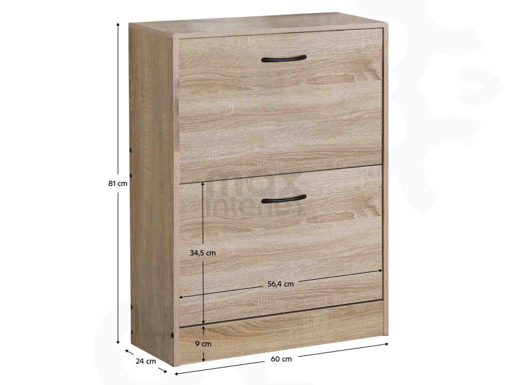 Botník je vybaven dvěma výklopy, každý z nich je rozdělen na dvě části, což umožňuje přehledné uložení bot. Vrchní deska je vhodná jako odkládací plocha pro drobnosti nebo dekorace. Díky spodní mezeře o výšce 9 cm je úklid pod botníkem rychlý a pohodlný.