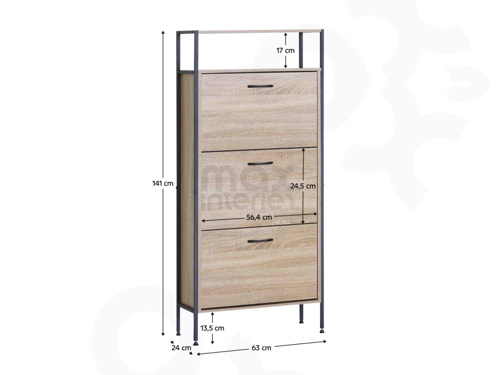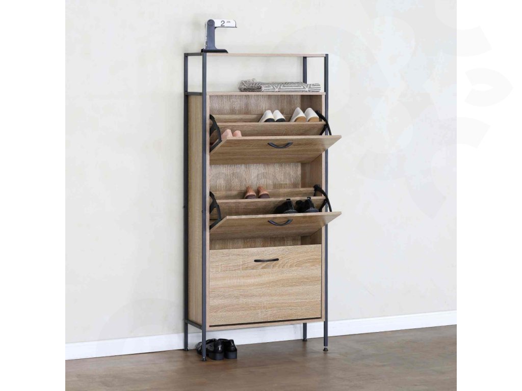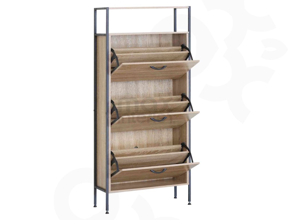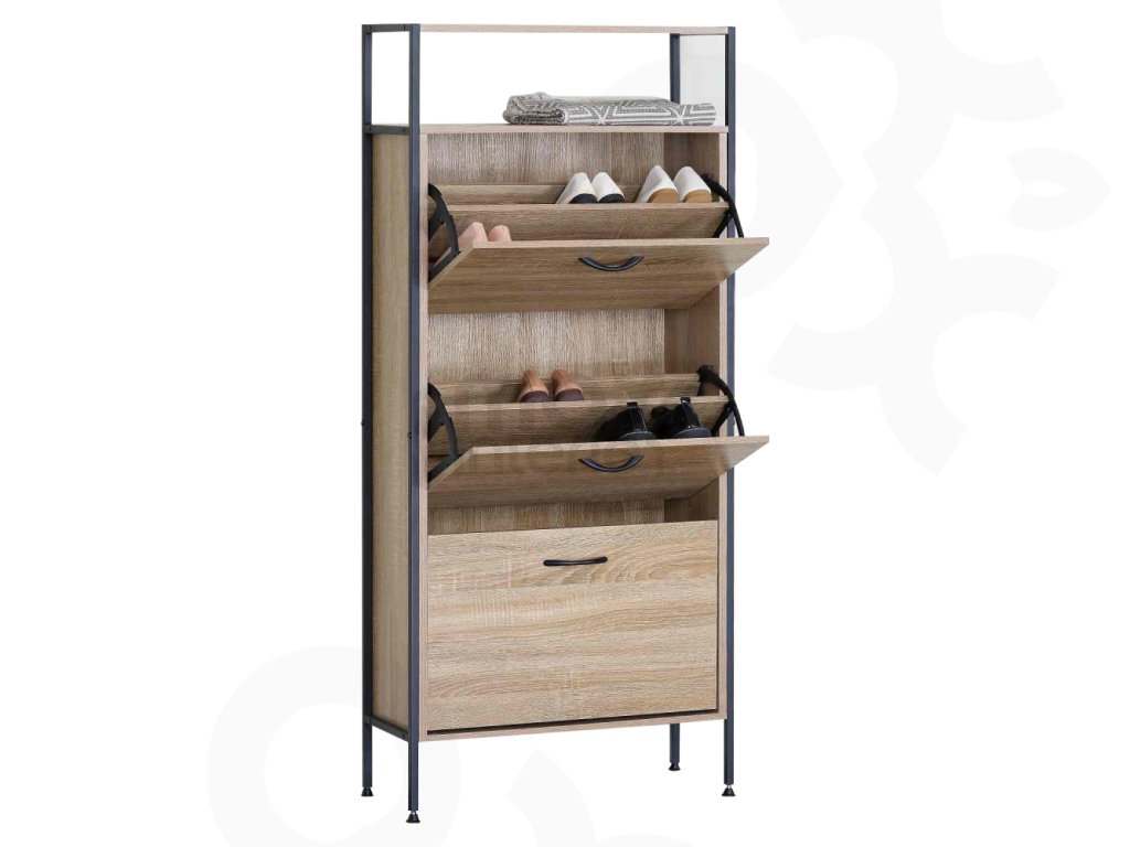 Botník je vybaven třemi výklopnými šuplíky, z nichž každý je rozdělený na dvě části, což umožňuje přehledné uložení více párů bot. Nosnost jednoho šuplíku je 6 kg, přičemž vrchní deska unese až 10 kg, takže na ni můžete umístit dekorace nebo drobné doplňky.
