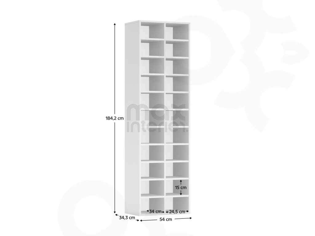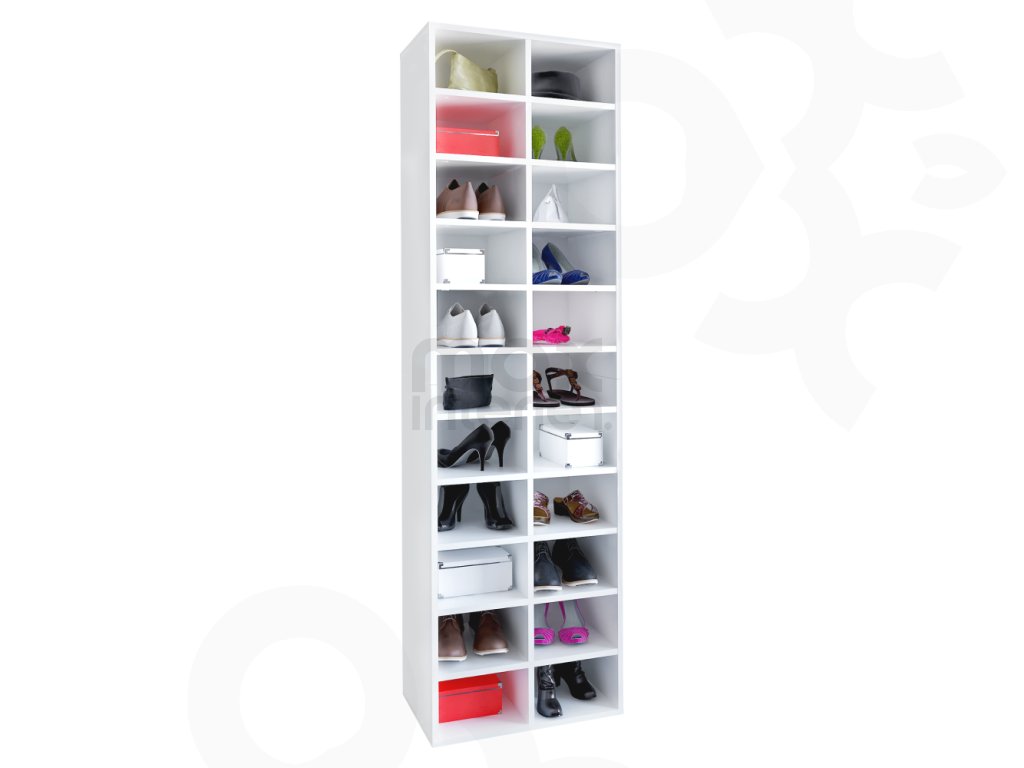 Konstrukce je vyrobena z laminované DTD o tloušťce 1,6 cm, která zajišťuje pevnost a dlouhou životnost. Otevřený policový systém poskytuje snadný přístup ke všem uloženým věcem. Každá z polic má nosnost až 5 kg, což umožňuje bezpečné uložení obuvi, knih nebo textilu. Dvouřadé uspořádání zvyšuje funkčnost a přehlednost.