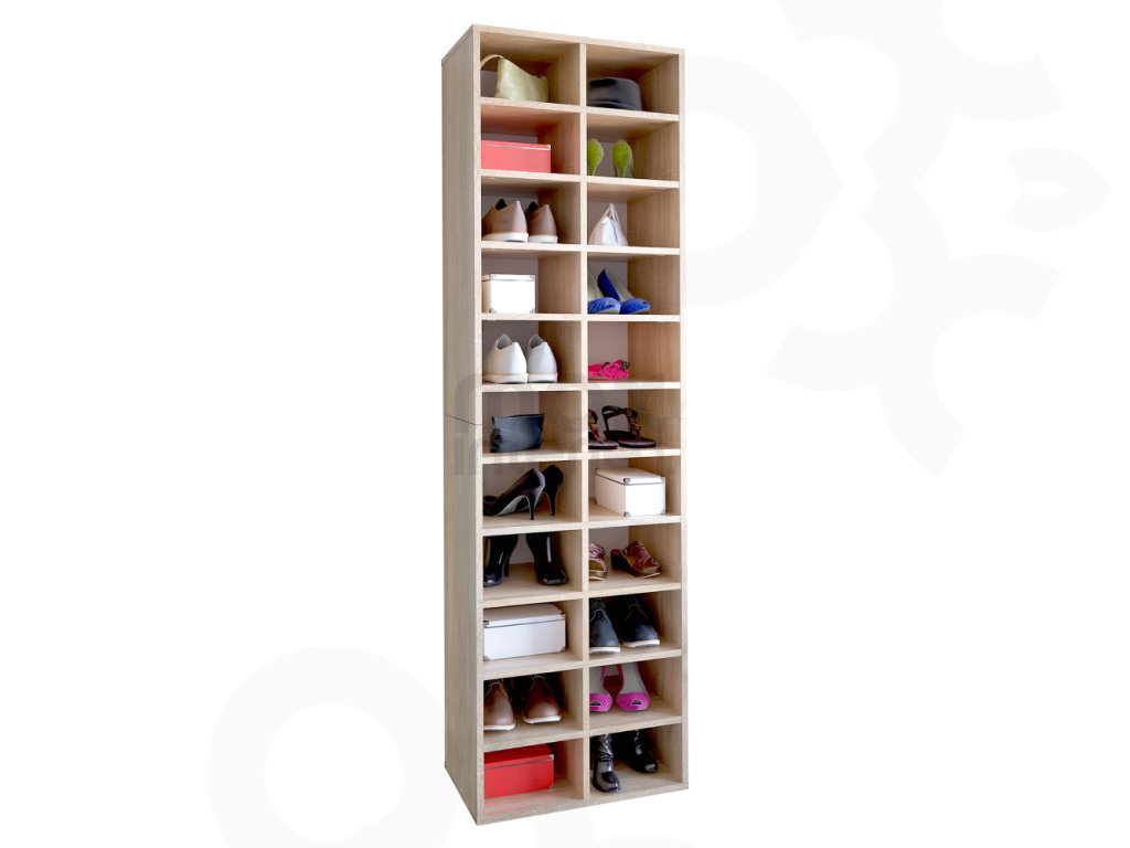 Konstrukce je vyrobena z laminované DTD o tloušťce 1,6 cm, která zajišťuje pevnost a dlouhou životnost. Otevřený policový systém poskytuje snadný přístup ke všem uloženým věcem. Každá z polic má nosnost až 5 kg, což umožňuje bezpečné uložení obuvi, knih nebo textilu. Dvouřadé uspořádání zvyšuje funkčnost a přehlednost.